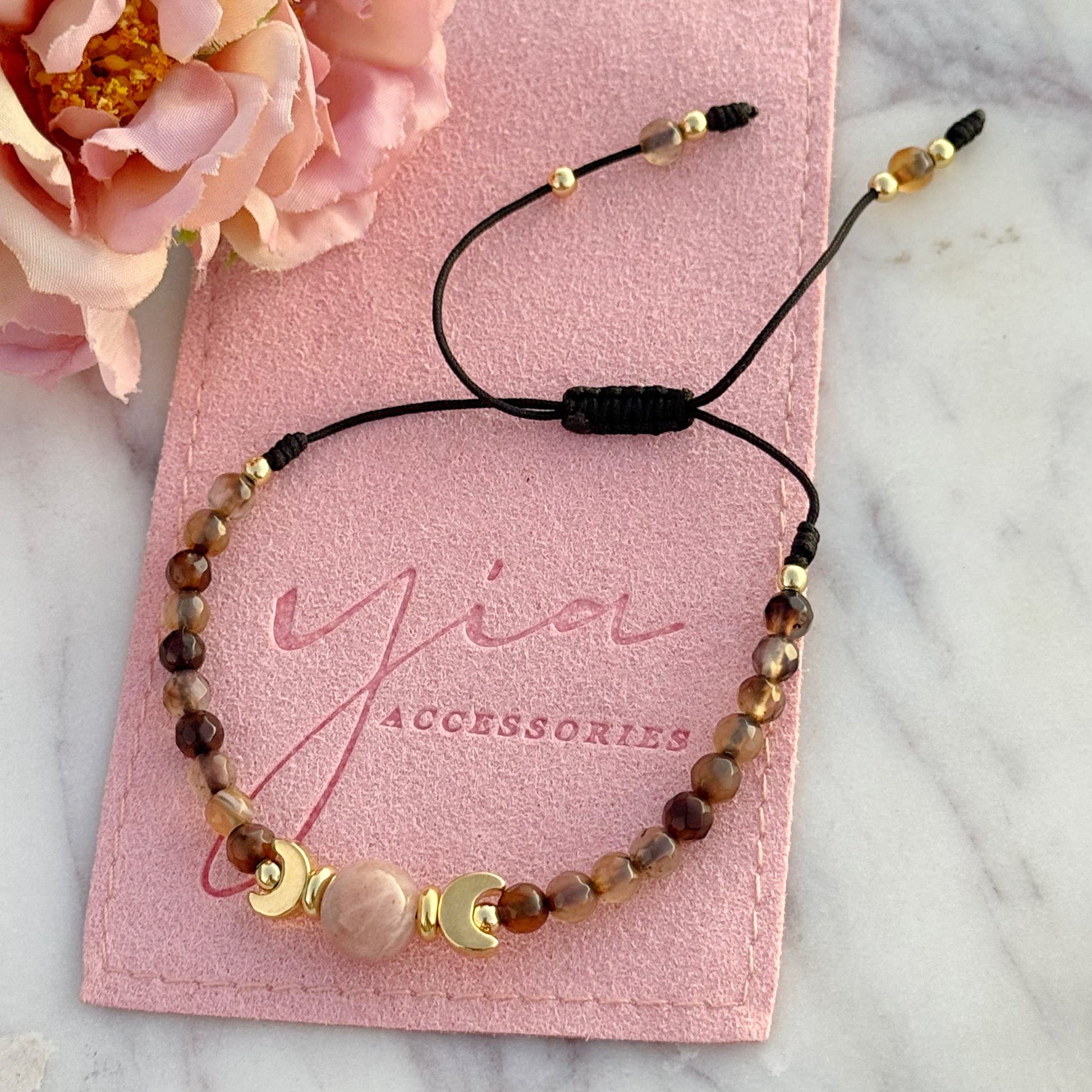 This bracelet features natural sunstone and agate beads, known for their grounding and healing properties. Experience balance and spiritual clarity with Grounded Radiance.